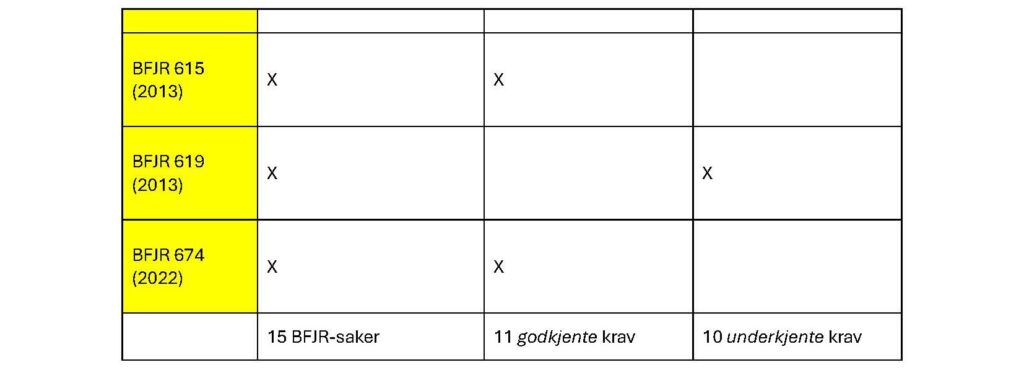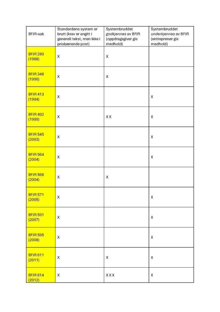 Her følger en oversikt over BFJR-avgjørelser vedrørende krav i generell tekst som ikke er medtatt i en prisbærende post: