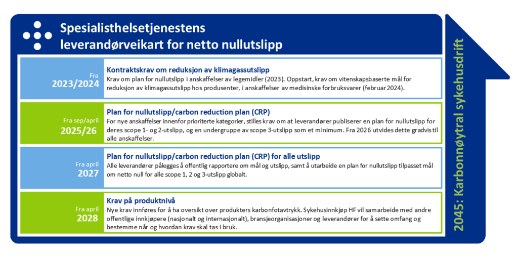Det fremgår av styresaken at spesialisthelsetjenesten har et felles mål om miljø- og klimanøytral drift i 2045. Et av tiltakene for å nå målet, er å jobbe aktivt med spesialisthelsetjenestens indirekte klimagassutslipp som ligger i kjøp av varer og tjenester. Det er derfor satt i gang et arbeid med å stille krav til leverandører om at de skal jobbe aktivt med å redusere sine utslipp, heter det, og veikartet for dette arbeidet er for å sikre både forutsigbarhet og måloppnåelse.
